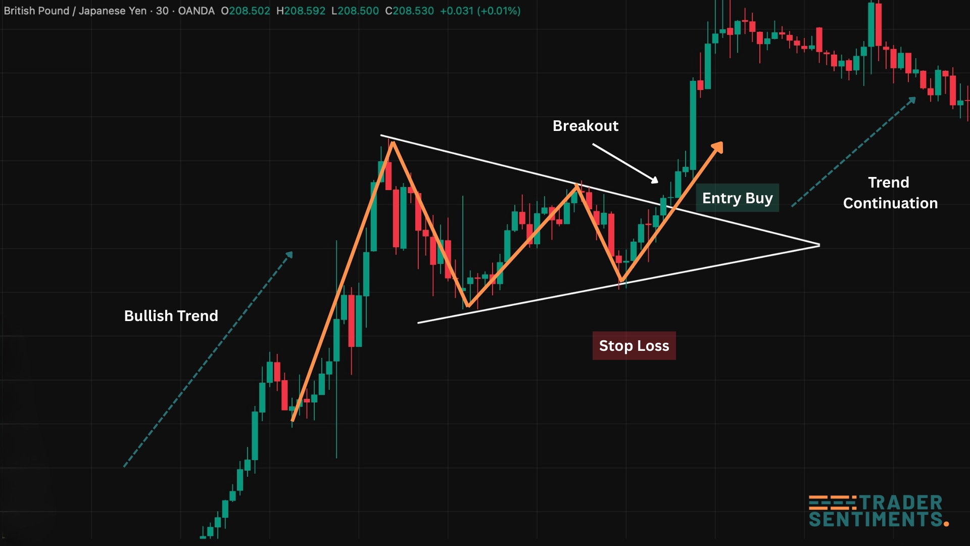- Breakout: Price breaks above upper trendline with volume.