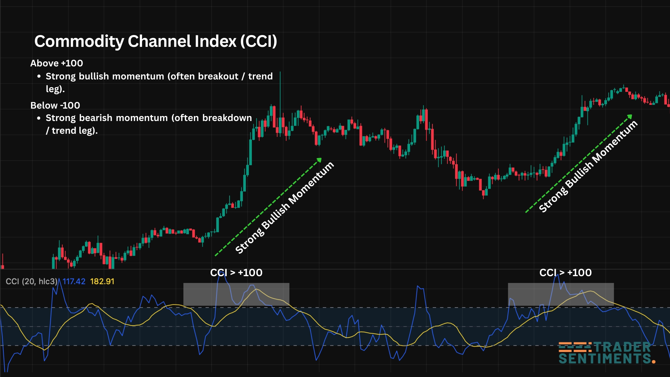 Example: CCI crossing +100 often signals strong upside momentum; -100 signals strong downside momentum.